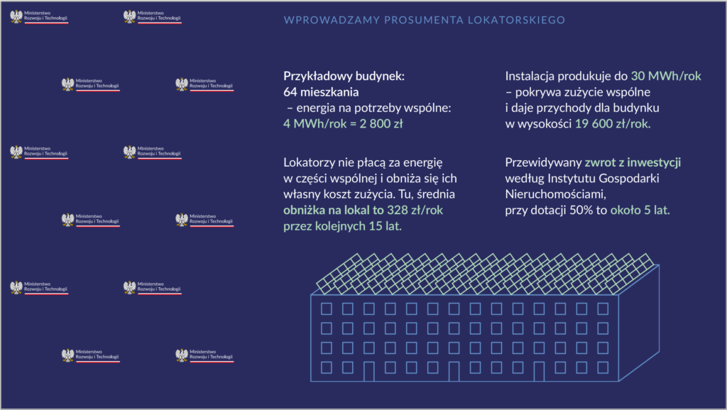 - Zarządzający budynkiem wielolokalowym (TBS, spółdzielnia, wspólnota) będzie mógł zainwestować w większą instalację, niż jest potrzebna dla części wspólnej.