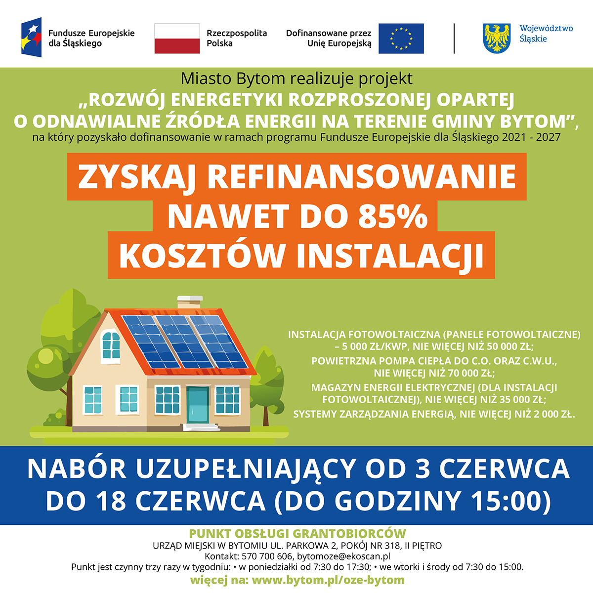 19 maja zostało podpisane zarządzenie nr 213/25 Prezydenta Bytomia w sprawie ogłoszenia naboru uzupełniającego deklaracji udziału w projekcie pn. „Rozwój energetyki rozproszonej opartej o odnawialne źródła energii na terenie Gminy Bytom”, realizowanego w ramach Programu Operacyjnego Fundusze Europejskie dla Śląskiego na lata 2021-2027. Priorytet FESL.10 „Fundusze europejskie na transformację” Działanie FESL.10.06 „Rozwój energetyki rozproszonej opartej o odnawialne źródła”. Nabór deklaracji o udział w projekcie rozpocznie się 3 czerwca /od godziny 7:30/ i potrwa do 18 czerwca 2025 roku /do godziny 15:00/. Uwaga! Wcześniej i później przesłane deklaracje udziału w projekcie nie będą brane pod uwagę.
